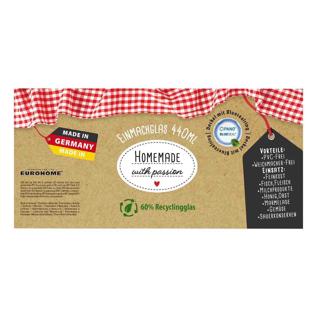 Einmachglas aus 60% Recyclingglas - Made in Germany - mit Bluesealring (Pano Deckel) Vorteile: PVC-Frei, Weichmacher-Frei. Einsatz: Feinkost, Fisch, Fleisch, Milchprodukte, Honig, Obst, Marmelade, Gemüse und Sauerkonserven